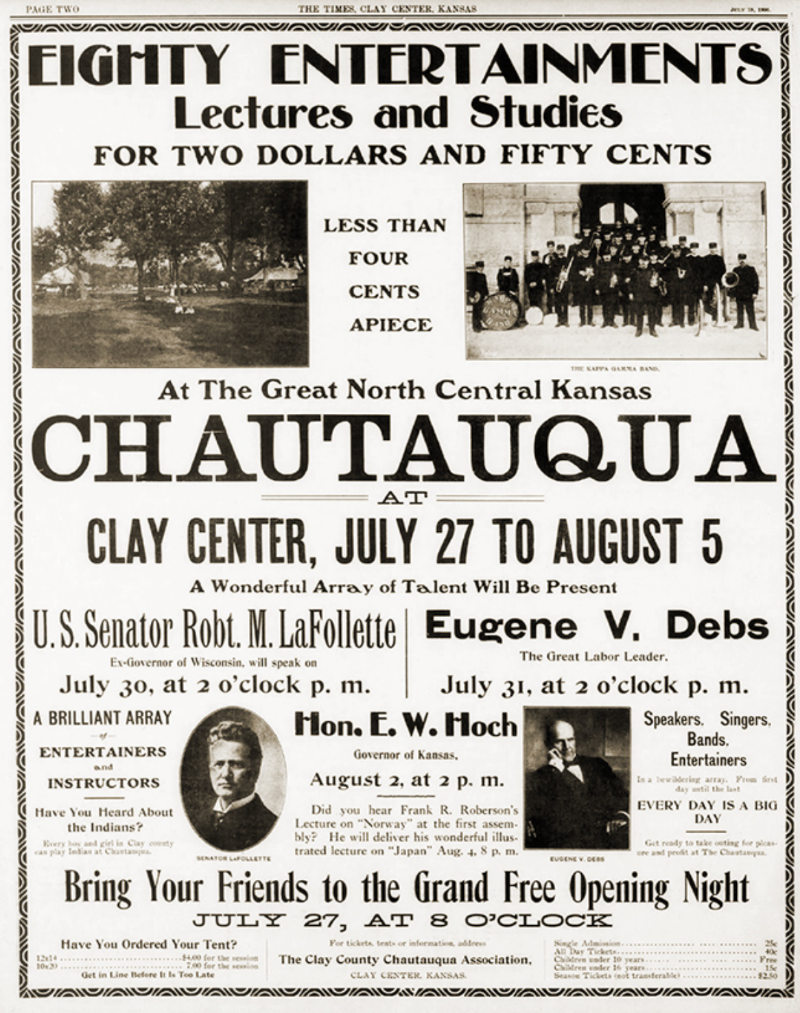 Chautauqua 始于 150 年前,位于纽约州西部的 Chautauqua 湖边。最初是由一群人道主义的主日学校教师创建的,他们希望互相教授和学习。那时大多数人没有上大学的机会,于是人们带来了大量书籍互相分享。后来他们决定每年都回来。随着时间的推移,Chautauqua 变得更加世俗化,更注重学习。五年后他们开始想:“我们是否应该建个小屋子?既然我们每年都来,不如建个稍微永久一点的,这样就不用每年都搭帐篷。”又过了十年后,他们想:“要不我们建个小房子吧。这样就不用住在小棚子里了,也更舒适。”随着活动时间逐渐延长,几十年后,他们终于意识到:“干脆在这里建个城镇吧,这里已经成为我们的家了,只需要建造房屋就可以。