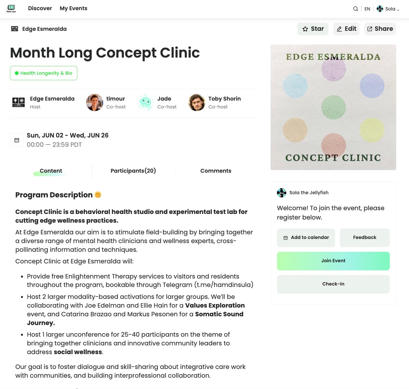 我不打算整年环游世界,但我更想在这里创造一种体验,这将是一个初步版本,比如在旧金山做一个为期六个月的 Vitalia0.2 版本,而不是一个月。我们现在基本上是在自费,但提供的东西却非常有价值。我认为我们可以找到一种既能保证提供好的东西,又能维持生活的方法。